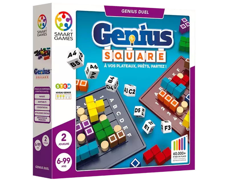 Piensa rápido para resolver los desafíos antes de que tu contrincante. Tira los dados, coloca los 7 cuadros blancos a los que llamaremos "bloqueadores" en el tablero de juego y completa el cuadrado usando las 9 piezas del rompecabezas restantes. No olvides que la piezas blancas no se deben mover luego de colocarlas en el tablero.